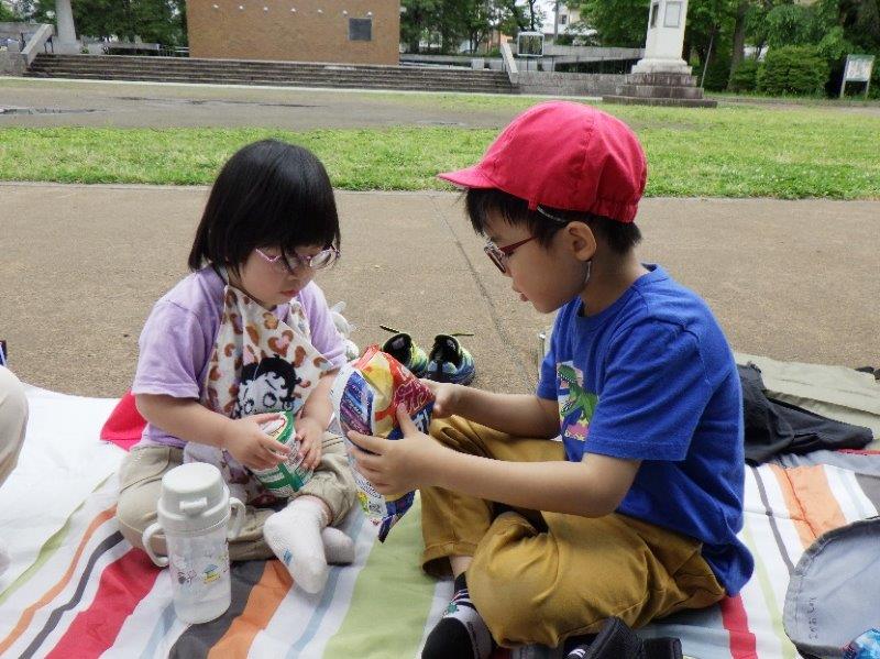 5月16日(木)、幼稚部の幼児2名は、春の遠足で富士森公園へ行きました。年長の幼児は、スーパーでおやつを買ってから公園に向かいました。100円玉、10円玉などを確認して、レジの精算機にお金を入れることができました。