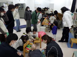 くまさんが歩く音を、積み木で空き箱を叩いて「トコトコトコ」、くまさんがおなかを叩く音を、手でバランスボールを叩いて「ポン!」などと、身の回りのものやおもちゃ、楽器などを使って音を鳴らしました。集まったお客さんは耳を澄ませてお話と音を楽しみ、終了後には、どんなものを鳴らしていたのか幼児のところに見に来る様子も見られました。