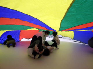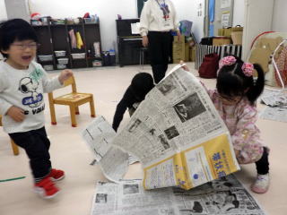 子供たちは、新聞紙を布団に見立てて寝転がったり、丸めて的当てをしたりして遊びました。また、大きなパラバルーンを使って、風や布の感触を感じる遊びを楽しみました。保 護者は、本校理療科教諭の話を聞き、子供の将来を考える良い機会となりました。