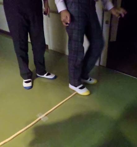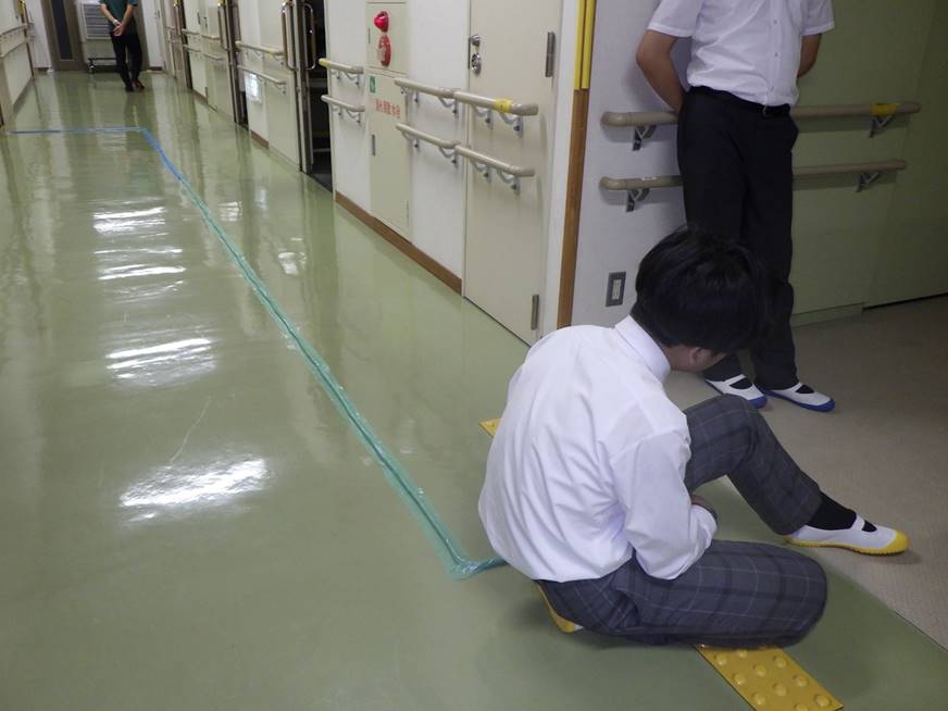 避難先で、自分一人で移動できるよう、床にガイドロープを張りました。ロープの高さも生徒たちで話し合いながら決めました。