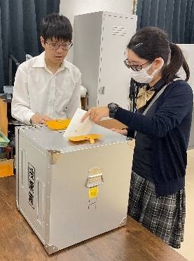 生徒会長候補と書記候補の2名による立会演説会の後、一人ずつ別室で信任投票に臨みました。選挙管理委員の皆さんの誘導や説明を受けて、八王子市の選挙管理委員会よりお借りした記載台と投票箱を使用して投票を行いました。