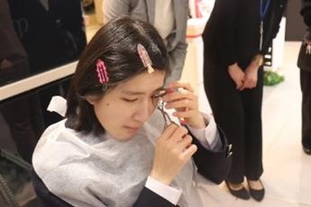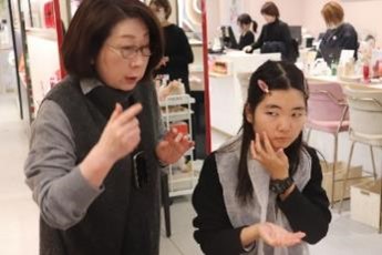 女子は、鏡を使わなくてもできるブラインドメイクについて、講師の方に説明を受けながら実際にメイクを体験しました。はじめは緊張でガチガチの3人でしたが、体験が進むにつれて少しずつ笑顔が見られるようになりました。メイクは鏡を使わないため、化粧水、ファンデーション、チークなどすべての工程を指で行いました。メイクが完成すると、いつもとは少し違った大人な雰囲気に変身しました。