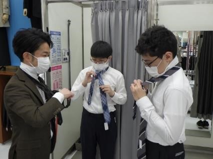 男子は、お店の方からネクタイの締め方について教えていただきました。また、ジャケット、ベスト、スラックスの3つを試着させていただき、スリーピーススーツを体験することができました。