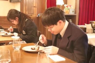 テーブルマナー教室は八王子駅近くの「ビストロ ボンクール」というレストランで行いました。普段使い慣れないフォークとナイフを用いて、前菜・肉料理・デザートの洋食コースを味わいました。お店の方からは丁寧に料理の説明をしていただくとともに、「お肉と野菜は一緒に食べると美味しい」など、より美味しく感じられる食べ方についても教えていただきました。どの料理も大変美味しく、自然と会話も弾み、楽しい時間を過ごすことができました。