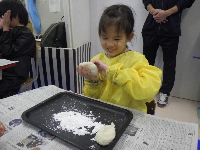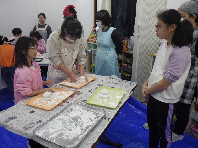 お餅をちぎったり伸ばしたりしながら、鏡餅を1人1つ作りました。