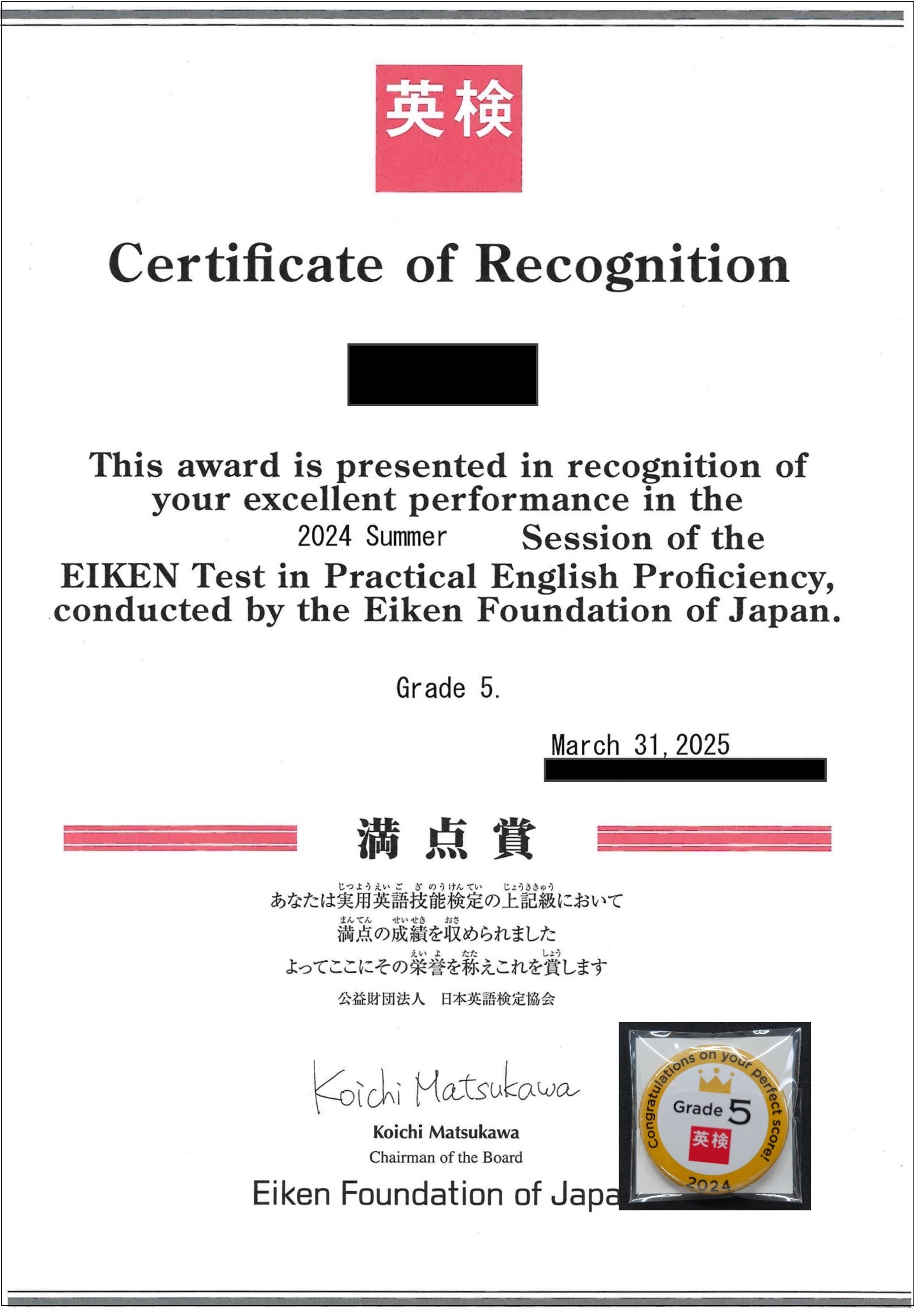 昨年度の実用英語技能検定において、本校生徒が満点の成績を収め、日本英語検定協会から賞と記念の満点バッジをいただきました。対象の生徒は1学期の終業式で表彰する予定です。