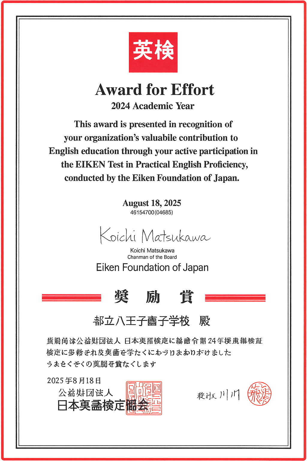 日本英語検定協会から「奨励賞」をいただきました。