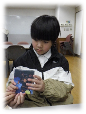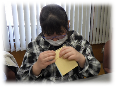 光の家の職員の方に教えていただきながら、メモ帳にリングを通す作業を体験しました。